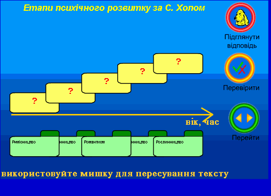у хронологічному порядку Для кожного модулю підготовлена аудіовізуальна презентація з обов’язковим виконанням завдань, що забезпечують індивідуальне опрацювання матеріалу і контроль його засвоєння. Розроблені матеріали з курсу „Вікова психологія” інтегровані в локальну мережу платформи "Moodle" та демонструються на науково-методичних семінарах з дистанційного навчання, що проводяться на постійній основі на базі НМЦ Дистанційного навчання при ДНУ. |